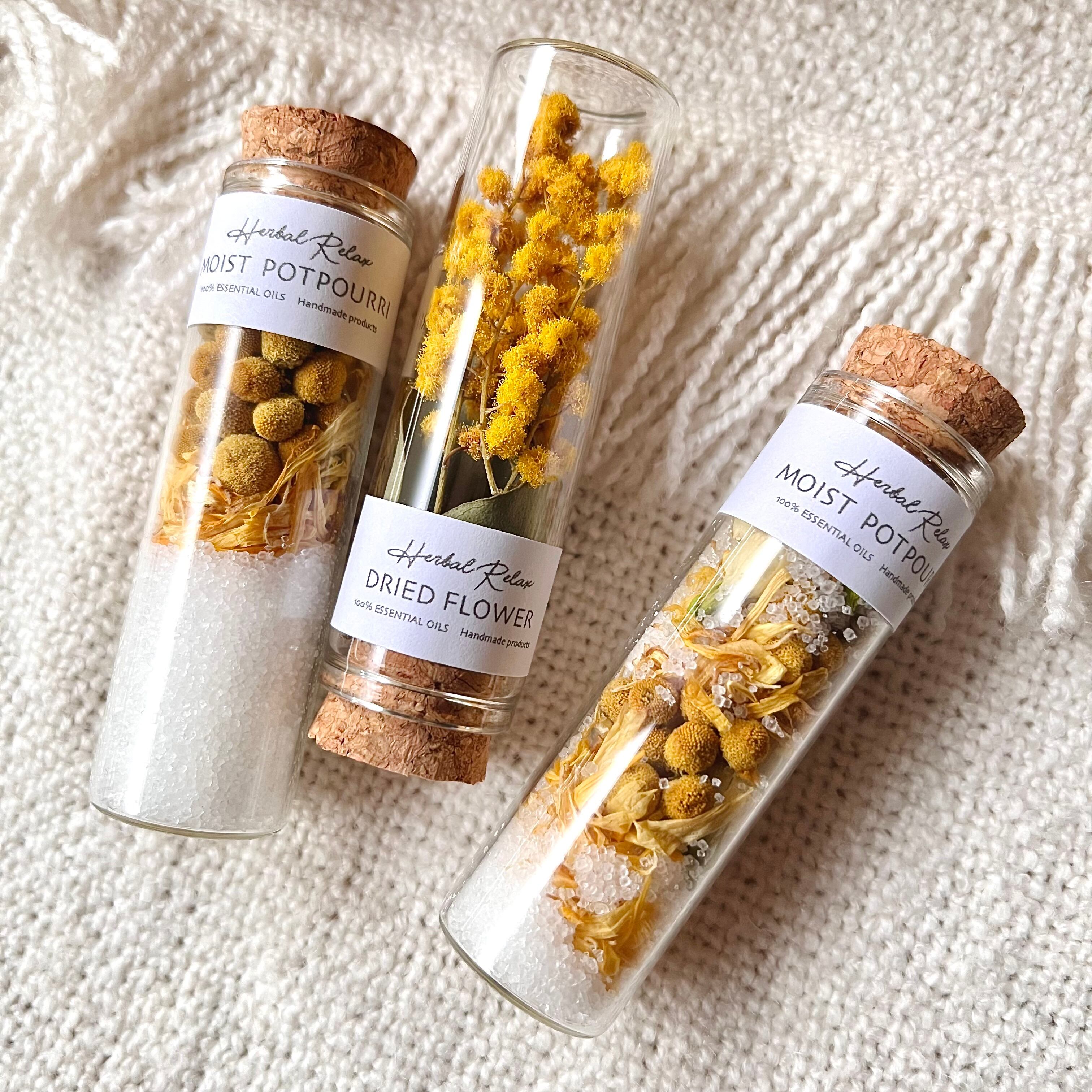 お花やハーブ(ドライフラワー)の選定からすべて手作業で行っているため、同じものはひとつとない、"あなただけのモイストポプリ"になります。
